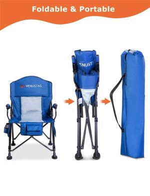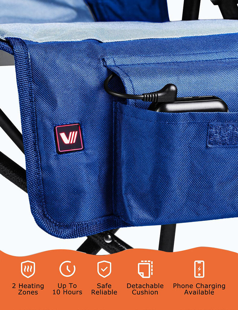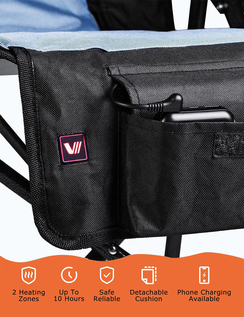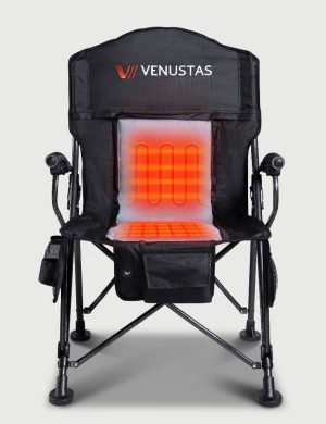 With a removable heated seat cushion, this heated camping chair keeps you warm and comfort in cold weather.Nylon material is water-resistant to shield you from rain and snow. And the carbon structural steel is stable, durable, and not easy to corrode.Two small pockets on the left side enables you to store something, like mobile phone. On the right side, a cup holder to provide great convenience.The weight of 13lbs and folding design make our heated outdoor chair easy to carry.CupHolderBigSide PocketCarbonStructural SteelHeating SystemExcellent Heating PerformanceCarbon fiber heating technology has remarkable thermal conductivity to heat quickly and evenly.2 Larger heating elements cover the backrest and seat to provide extra warmth, which guarantees a better using experience.3 adjustable heating levels are designed to adjust the customized warmth by pressing the power button.3-4?hrs on high, 6-7?hrs on medium, and 11?hrs on low heating setting.Portable & Reliable BatteryHeat in seconds with our 7.4V battery.With the capacity of 5,000mAh, the battery can work up to 12 hours.The battery is designed with 2 outputs, which can charge the chair and mobile phone simultaneously.Materials & CareMaterialsSeat Material: 100% NylonChair Frame: High Carbon SteelCareHand WashableDo not iron.Do not dry clean.Do not machine dry.Heating ElementHeating ElementPremium Carbon FiberHeating Zones2 Heating Zones (back and seat)Heating ModePre-heat: Red| High: Red |Medium: White| Low: BlueTemperatureHigh: 131a??/55a??, Medium: 113a??/45a??, Low: 100a??/37.8a??Working HoursHigh: 3-4 HRs, Medium: 6-7 HRs, Low: 11HRsHeating LevelWarmBattery InformationBatteryLithium-ion BatteryCapacity & [email protected] (37Wh???Size & Weight3.94??2.56??0.91in, Weight: 7.23oz/205gBattery InputType-C 5V/3ABattery OutputUSB-A 5V/2.1ADC 7.38V/2.4ACharging Time4 HoursApparelFitRegularLengthHip-lengthSeat Material100% NylonChair FrameHigh Carbon SteelFeatureWater ResistantSpecial FeatureFoldableGeneralCareHand WashableOcassionsOffice, Home. Vehicles, Outdoor Activities, Gym/Fitness Room, Massage and Therapy Centers, Outdoor RecreationSport TypeIce Sports, Winter Sports, Outdoor Sports, Motorcycle Riding, Sports Event SpectatingWarranty1 year on Battery2 year on Heating Elements (official website only)User ManualUser Manual DownloadHow long does shipping take and how can I track my package?Usually delivering within 5-7 business days. You can track your package here:https://venustas.aftership.com/Are heated chairs safe?Yes, our heated chairs are safe. However, please ensure not to use the heating function until the chair is completely dry. Additionally, if you have a cardiac device, it is advisable to consult with your doctor or the pacemaker manufacturer before using a heated chair.Can I wash the heated chair?Recommend hand washing.Can I take a heated chair?on a plane?Yes, our heated chairs are TSA-friendly. Both the power bank and the heated chair can be taken on the plane. However, please note that if you need to check in the heated chair, remember to take out the power bank and carry it with you.Can I take a heated chair on an airplane?Yes, both our heated chair and battery can be taken on the plane. Generally, you can use it’s heating function on the plane. However, you should always follow the specific guidelines and requirements of the airline.How long does the heated chair last?High: 3HRs, Medium: 6HRs, Low: 10HRs (All heating area working ).How to choose the right size?Choosing the right size is easy! Simply refer to our size guide, which you can find on the product page. Measure your chest, waist, and hips, and match the measurements to the corresponding size on the chart. If you have any specific questions or need assistance, feel free to ask. We want to make sure you get the perfect fit!What power bank for heated chair?To ensure better results and a longer service life of the heated vest. Please use our special Venustas-6000 power bank.How to turn on heated chair?To turn on,press and hold the power button for 3 seconds. The?chair will begin to preheat for 5minutes (blinking red LED).