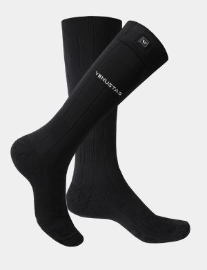 Crafted with core-spun technology, these socks feature excellent moisture-wicking to keep your feet dry and odor-free.The durable polyester-blend fabric stands up to daily wear and tear like a champ.The yarn of these socks is tightly woven for extra support and a fit that stays in place all day.High-stretch ribbed cuffs with a stay-put fit that maintains a held-in feel and prevents slippage.Easy access to the battery with the handy flip-top pocket.Core-spunTechnologyHigh-stretchRibbed CuffsFlip-TopBattery PocketHeating SystemVenustas-Warm? Heating TechnologyUltra-fine composite heating wires provide instant warmth without adding bulk.Heat on the forefoot for targeted warmth and optimal comfort.3 heating settings (High, medium, low) with a simple press of the button.3.5 hours on high, 5.5 hours on medium, and 11 hours on the low setting.Smart technology automatically adjusts to medium heat after 15 minutes on high level.Battery PerformanceTwo 7.4V/2000mAh batteries heat up fast and keep you warm for up to 11 hours.7.4V DC output port delivers consistent power for quick heat.Lightweight at just 70g, these batteries are easy to place and allow for ease movement.Fully charge in 2 hours with an 8.4V/1A charger.Safety certified by UL, CE, FCC, UKCA, and RoHS.Materials & CareMaterialsMaterial: 25%?Acrylic